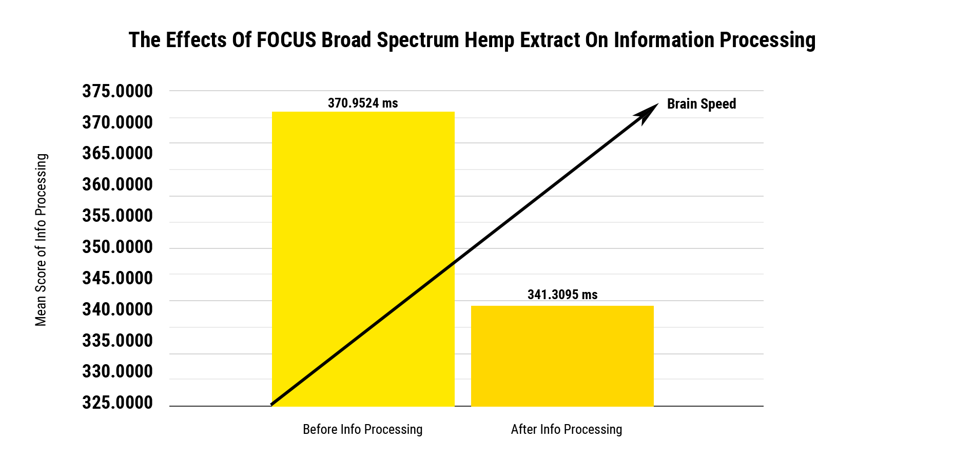 Mean information processing speed at baseline testing (before subjects took FOCUS) was 370.9 ms. After taking FOCUS, this decreased to 341.3 ms. The difference is statistically significant with a p value of 0.010.